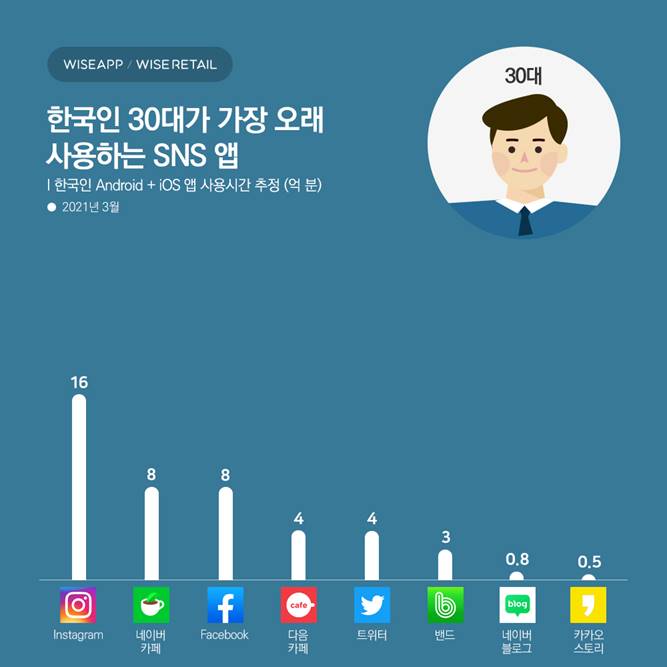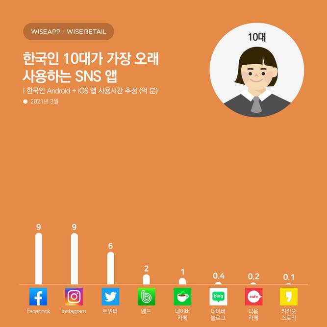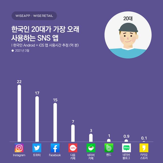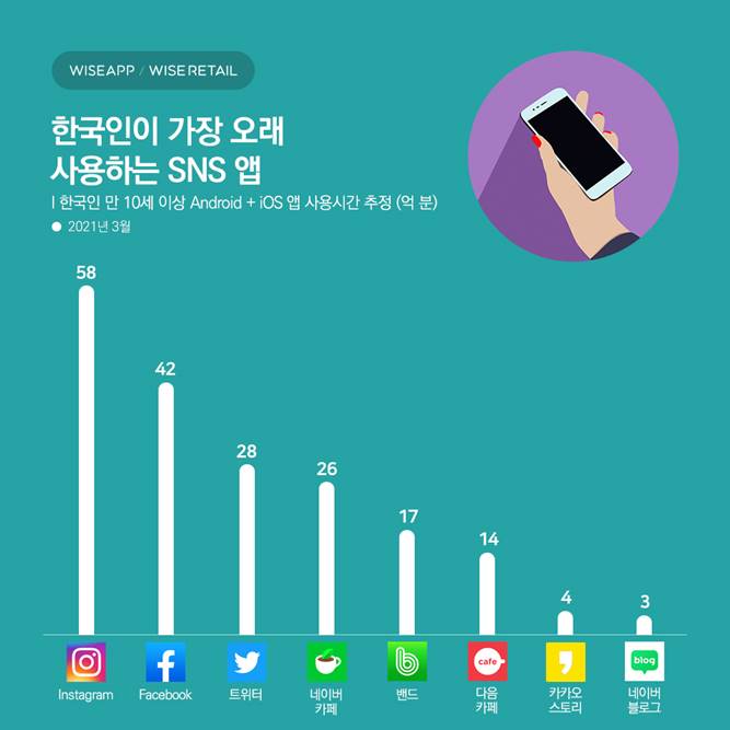 와이즈앱·와이즈리테일이 지난 3월 한국인 만 10세 이상 스마트폰 사용자를 표본 조사한 결과, 모든 세대를 합쳐 한국인이 가장 오래 사용한 SNS 앱은 ‘인스타그램’으로 한 달 동안 총 사용시간이 58억 분으로 조사됐다.