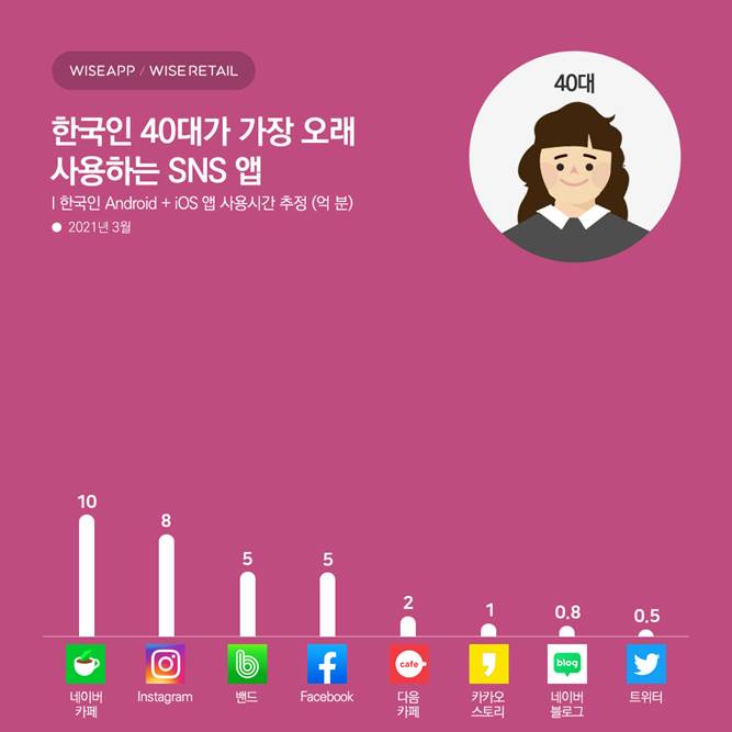 40대는 네이버 카페, 인스타그램, 밴드, 페이스북 순으로 사용시간이 많았다.
