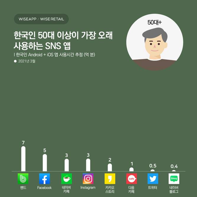 인스타그램 뒤로 가장 오래 사용한 SNS 앱은 페이스북 42억 분, 트위터 28억 분, 네이버 카페 26억 분, 밴드 17억 분, 다음 카페 14억 분, 카카오스토리 4억 분, 네이버 블로그 3억 분의 순이었다.