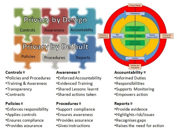 디자인과 기본값에 의한 데이터 보호(privacy by design and default)는 GDPR 하에 추가된 새로운 요구 사항이며, 이는 데이터 컨트롤러가 그들의 개인 데이터를 처리함에 있어서 개인의 권리와 자유를 보호하는 데 전반적인 접근 방식의 일부로 구현해야 하는 또 다른 ‘기술적 및 조직적 조치’로 설명할 수 있다. 여기에는 모든 필요한 안전 조치를 처리 활동에 통합하는 것도 포함된다.