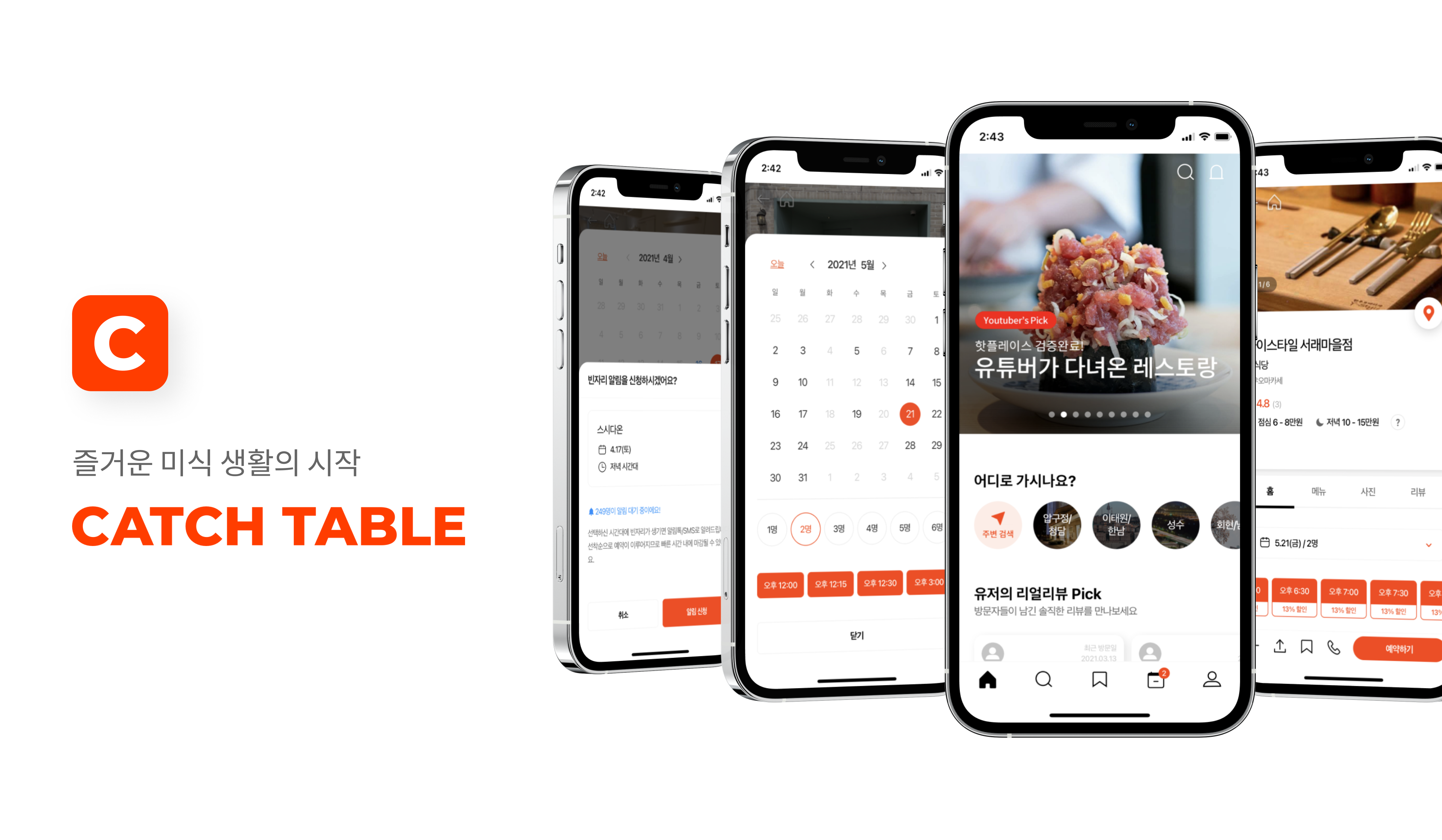 캐치테이블은 간단한 정보를 입력하면 레스토랑을 예약할 수 있는 실시간 레스토랑 예약 플랫폼이다. 소비자에게는 쉽고 편리하게 이용할 수 있는 예약 서비스를 제공하고, 레스토랑에게는 수월하게 예약관리 문제를 해결할 수 있는 예약관리 솔루션을 제공하고 있다.