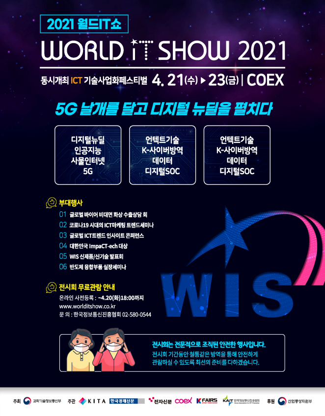 월드IT쇼는 민간주관/정부지원으로 매년 개최해온 ICT분야 최대의 국내 전시회다. 지난 2008년부터 계속되어 온행사는 올해 코로나19 사회적 거리두기 방역수칙을 준수하여 사전·사후 방역실시, 손소독, 발열 검사 등 철저한 방역조치 하에 진행될 예정이다.