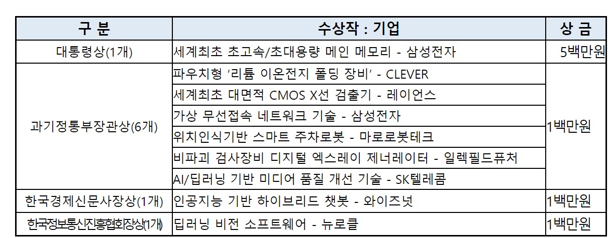 우수기업 시상식(2021 ImpaCT-ech 대상 시상식)에서는, 세계 최초 초고속(7.2Gbps), 초대용량(512GB) 메인 메모리를 저전압(1.1V)에서 안정적으로 구현한 삼성전자의 ‘DDR5 SDRAM’가 대통령상을 수상한다. 그 외 (주)클레버, (주)레이언스, (주)마로로봇테크, 일렉필드퓨처(주), SK텔레콤(주), (주)와이즈넛, (주)뉴로클이 과기정통부 장관상을 수상하는 등 총 9편이 수상된다.