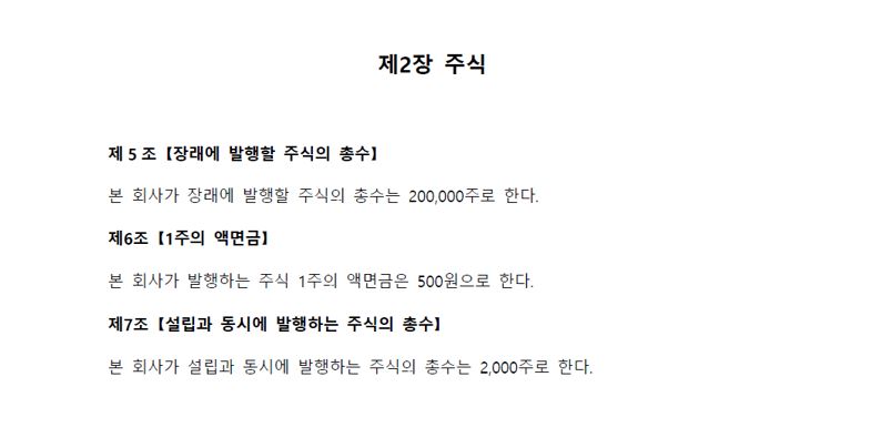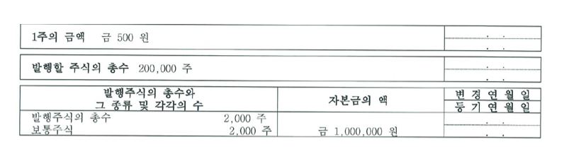 액면가는 시장에서 거래되는 “시가”도 아니고, 투자받거나 증자할 때 정해지는 “발행 가액”도 아니다. 액면가는 변동되는 금액이 아니라 고정 금액인 것으로 위 등기부등본을 참고해보면, 반드시 자본금(1,000,000원) = 액면가(500원) x 발행주식의 총수(2.000주)가 맞아떨어져야 한다.(발행할 주식의 총수와 구별 주의).