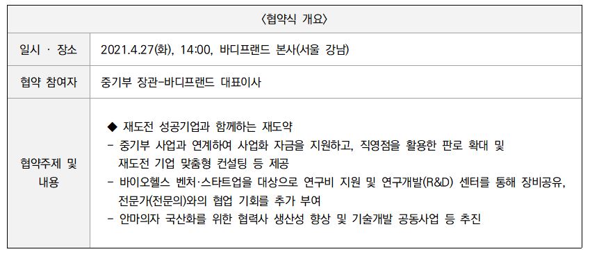 중소벤처기업부(이하 중기부)는 4월 27일(화) 서울 강남 소재의 바디프랜드 본사에서 바디프랜드(대표이사 박상현)와 ‘재도전 성공기업과 함께하는 재도약’을 위한 업무협약을 체결했다고 밝혔다.