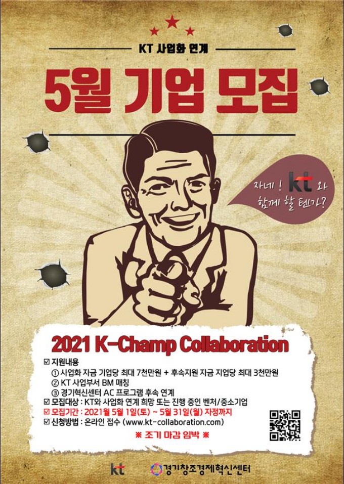 경기창조경제혁신센터(이하 경기혁신센터)는 5월 31일(월)까지 전담 기업 KT와 사업화 연계를 지원하는 ‘2021 K-Champ Collaboration(이하 K-챔프 콜라보레이션)’ 5월 참가 기업을 모집한다고 11일 밝혔다.