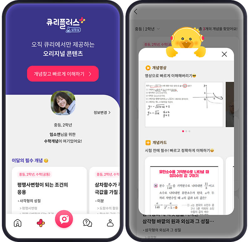 ‘큐리플러스’ 콘텐츠는 개념영상과 개념카드로 구성됐다. ‘개념영상’은 5분내외로 구성된 숏 클립 영상으로 애니메이션, 손 풀이, 강의 등 다양한 방식을 통해 수학 개념을 알려준다. 310개(중등 56개, 고등 254개)의 중, 고등 수학 개념 영상을 만나볼 수 있다. ‘개념카드’는 수학 개념을 2~4장의 카드로 간단하게 구성하여 총 1213개(중등 793개, 고등 420개)의 콘텐츠를 제공한다.