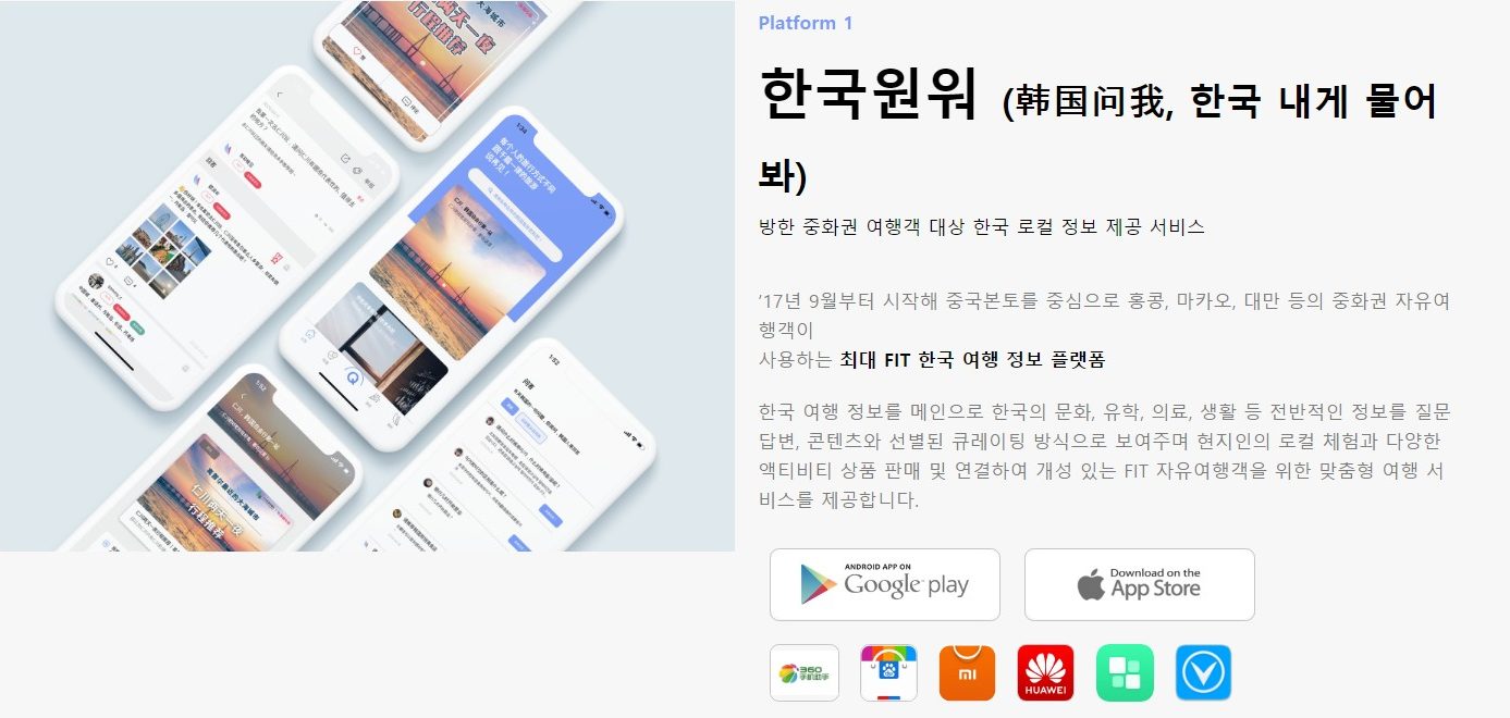 서비스인 한국원워(韩国问我)를 정식 런칭하여 3년 동안 국내 최다 중국인 자유여행객이 사용하는