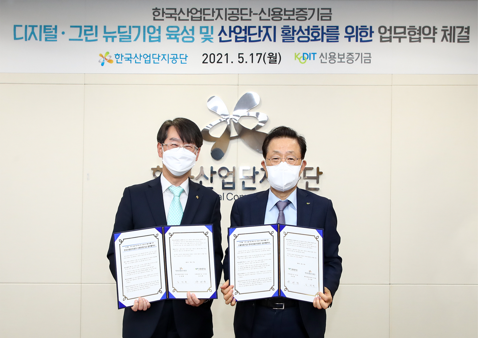 신용보증기금(이사장 윤대희, 이하 신보)은 한국산업단지공단(이사장 김정환, 이하 산단공)과 17일 대구시 소재 한국산업단지공단 본점에서 ‘디지털・그린 뉴딜기업 육성 및 산업단지 활성화를 위한 업무협약’을 체결했다고 밝혔다.