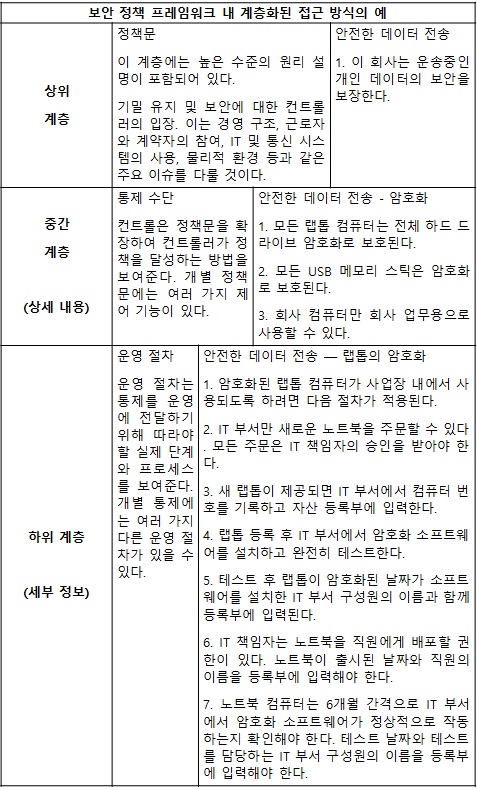 아래 표에는 정책문이 어떻게 제어와 운영 프로세스에 반영되는지의 예와, 보안 데이터 전송을 달성하는 데 도움이 되는 절차가 나와 있다.