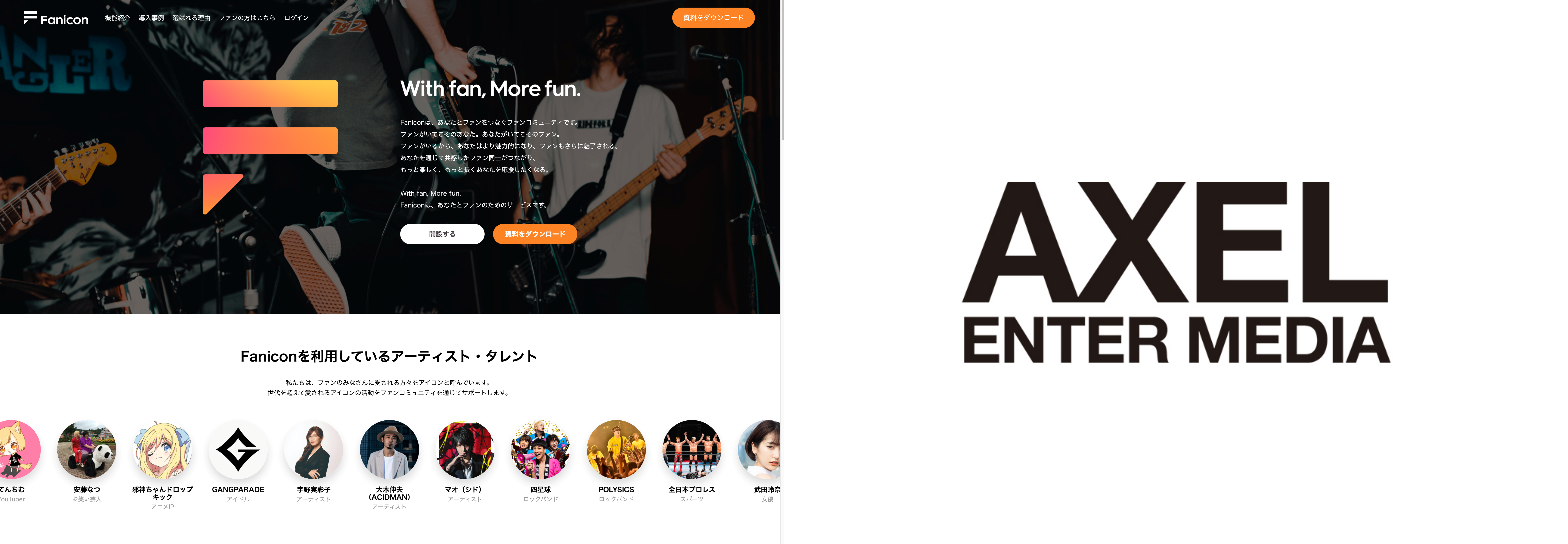 AXEL은 ‘Fun To Fans’을 캐치프라이즈로 내세우며 팬과 아티스트를 연결하며 수익 창출 모델을 만들고 있는 일본의 팬테크 컴퍼니다. AXEL은 유료 팬클럽을 개설하는 플랫폼을 제공하거나 공식 사이트 제작을 맡는다. 또한 아티스트와 팬이 소통할 수 있도록 굿즈를 제작해주기도, 굿즈 판매 채널을 제작하기도 한다. 또한 아티스트의 VR콘텐츠를 만들기도 하는 등 팬과 아티스트 사이의 활동이 다양한 수익모델을 낼 수 있도록 적극적으로 플랫폼과 콘텐츠를 제작해 지원하는 회사다.
