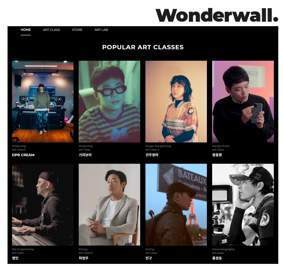 원더월 Art Class (아트 클래스)에서는 Music, Film&Photo, Creativity 세 분야에서 현재 70명 이상 아티스트의 콘텐츠를 시청할 수 있으며, 매달 새로운 아티스트 콘텐츠도 꾸준히 업데이트 되고 있다.