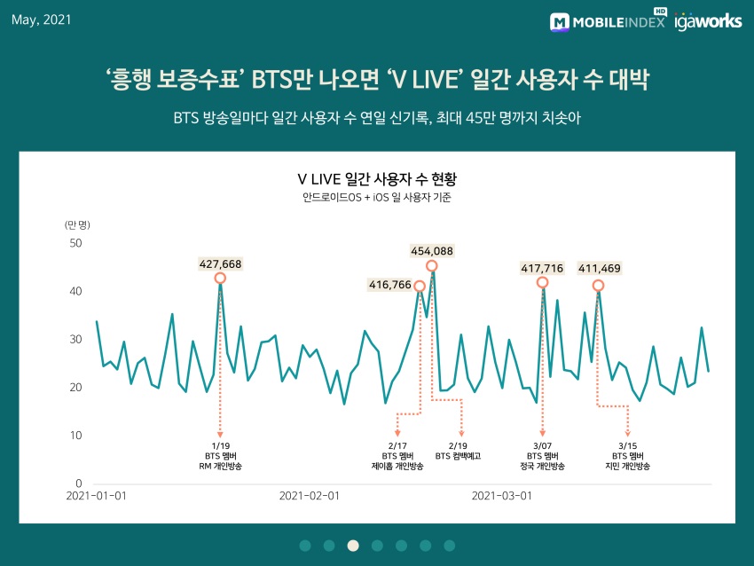 팬덤 앱 ‘V LIVE’가 4월 사용자수(MAU) 132만 7103명을 기록하며 업계 1위를 차지했다. 또한 BTS 출연일에는 ‘V LIVE’ 앱 일사용자수(DAU)가 급상승한 것으로 나타났다. ‘V LIVE’는 BTS 멤버 RM의 개인 방송이 진행된 1월 19일에는 일사용자수((DAU)가 42만 7668명을 기록했으며, 2월 19일 BTS 컴백 예고 방송일에는 45만 4088명까지 치솟았다.