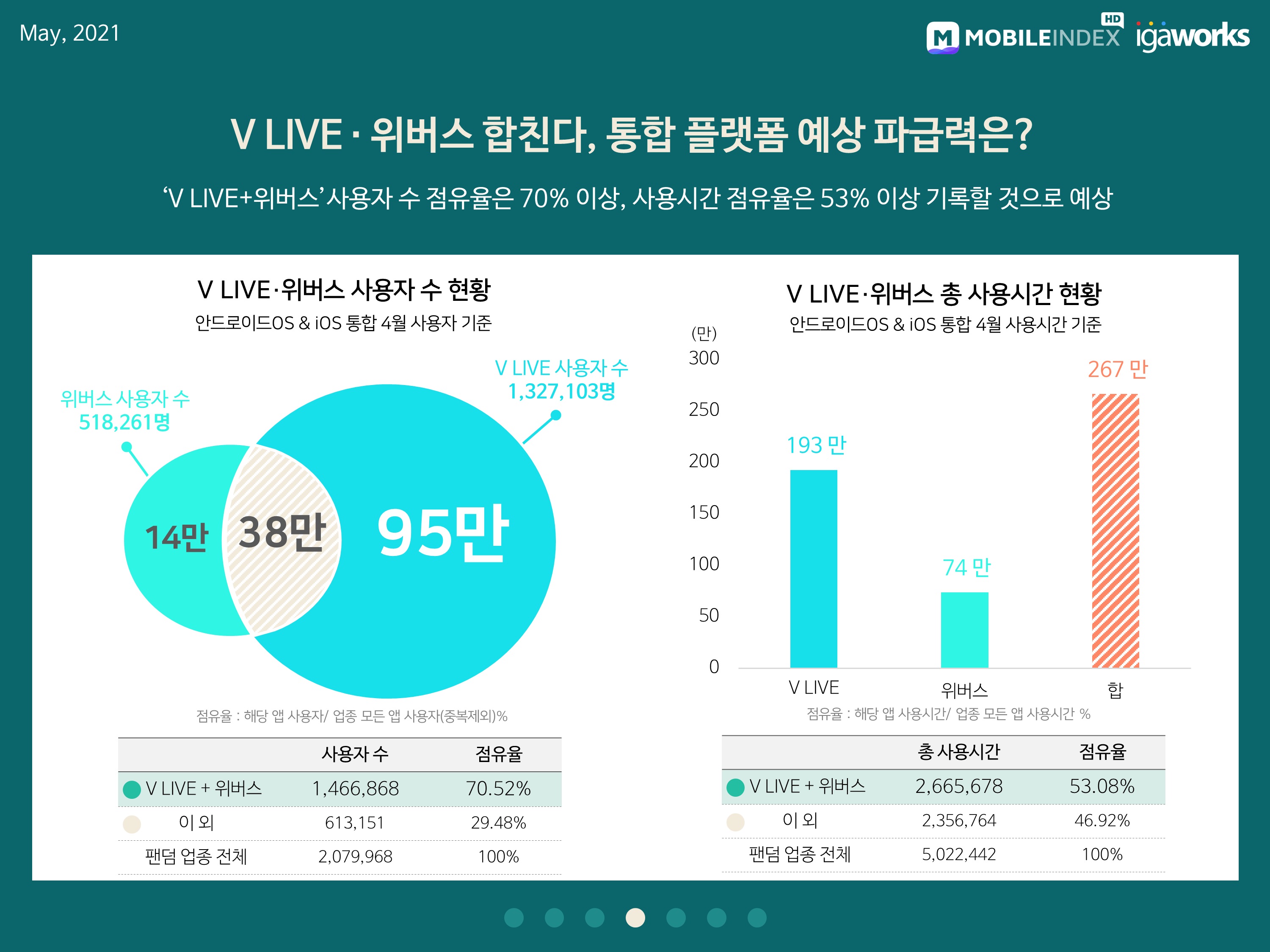 최근 플랫폼 통합을 선언한 ‘V LIVE’와 ‘위버스’의 4월 사용자수 합(중복제외)은 146만 6817명으로 확인됐으며, 이는 팬덤 앱 전체 사용자의 70.52%에 달했습니다.