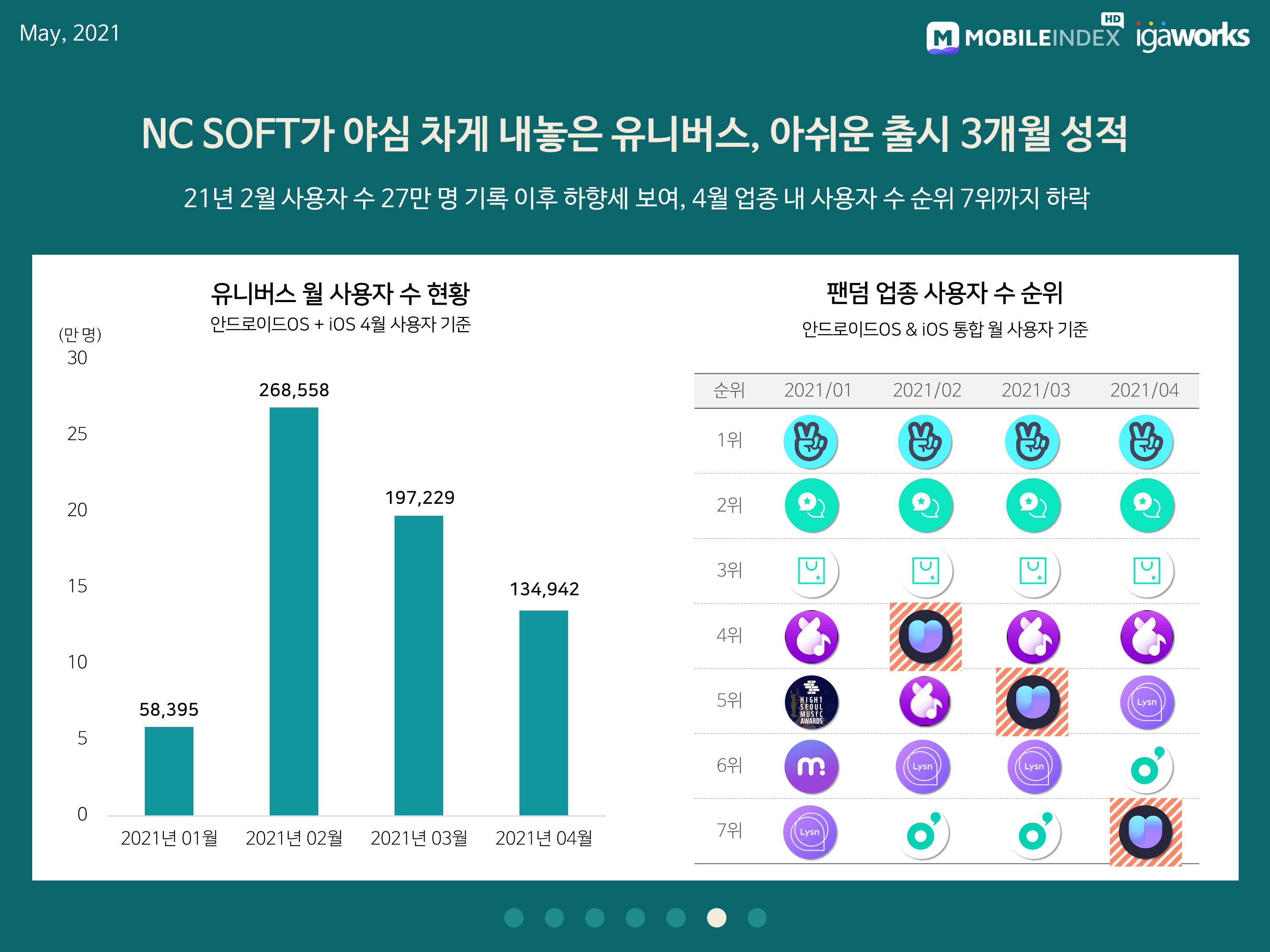 한편, 지난 1월 출시된 NC SOFT의 야심작 ‘유니버스’는 2021년 2월 사용자 수(MAU) 26만 8558명으로 업계 4위에 진입했지만, 3월과 4월에는 각각 월 사용자 수(MAU) 19만 7229명, 13만 4942명을 기록하며 하향세를 보였습니다.