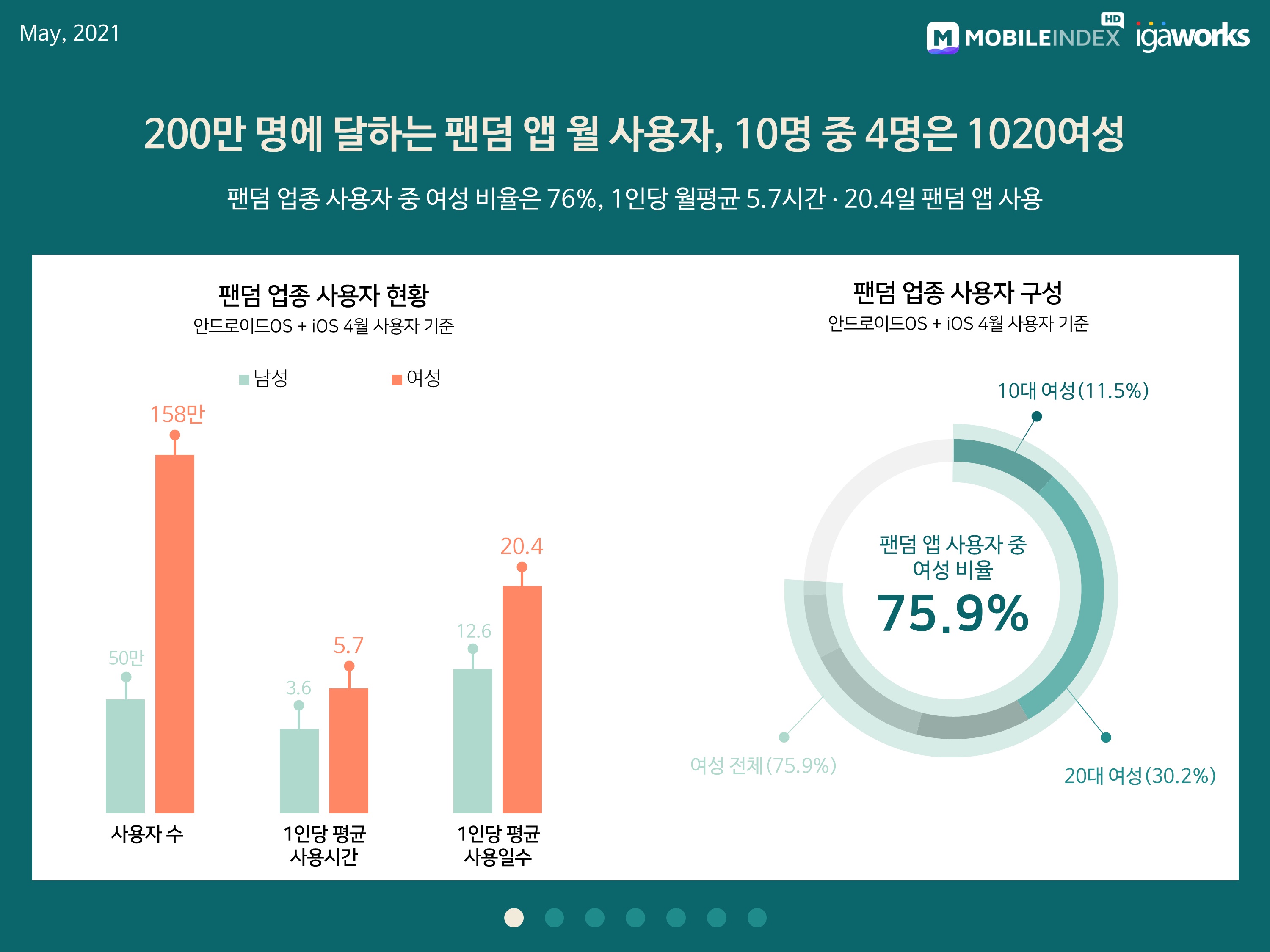 4월 전체 팬덤 업종 사용자수는 207만 9968명으로, 전체 사용자 중 여성(157만 9092명)이 남성(5만 876명) 사용자보다 3.15배가량 많았습니다.
