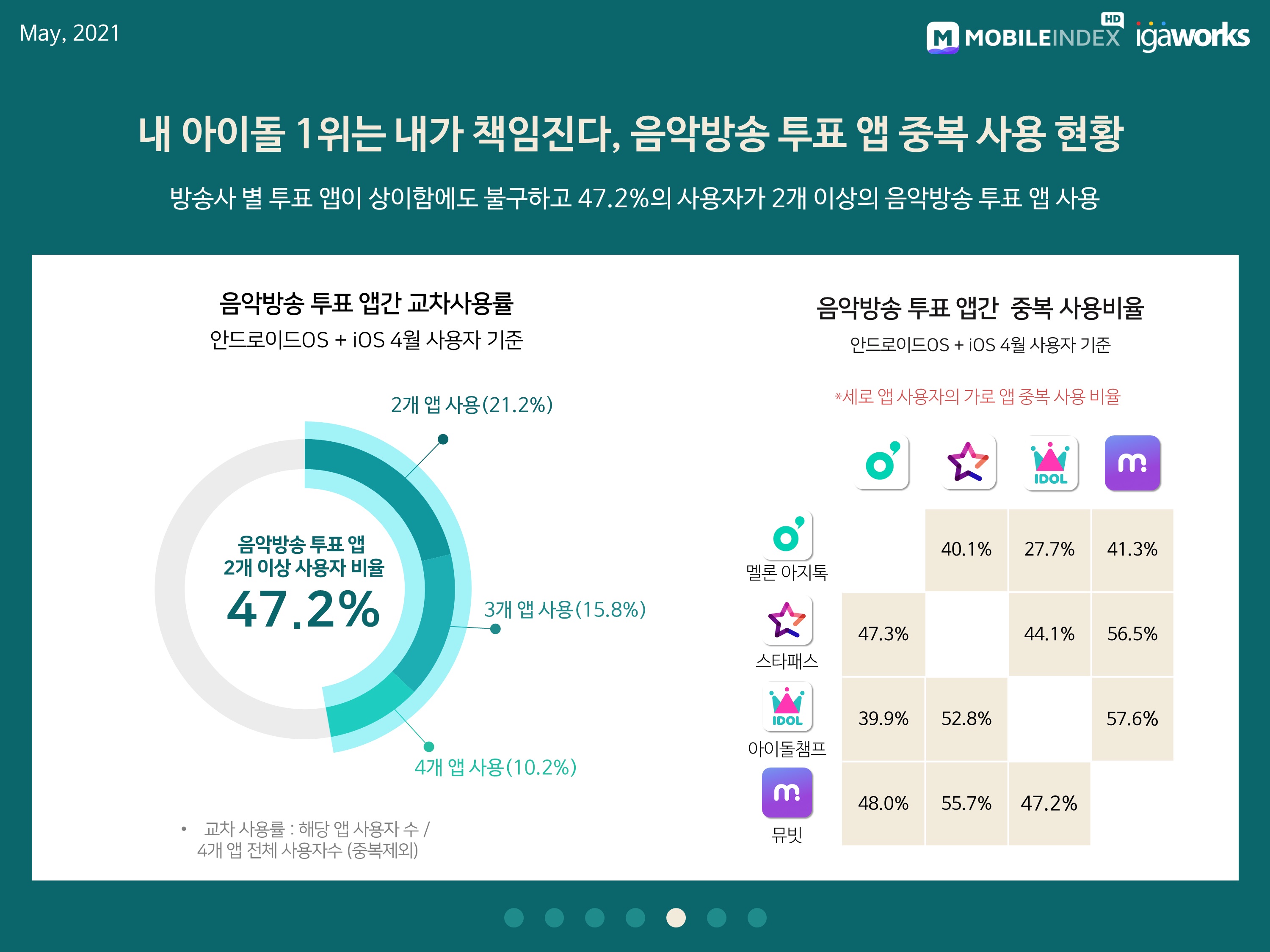 모바일 빅데이터 플랫폼 기업 아이지에이웍스가 자사의 데이터 분석 솔루션 ‘모바일인덱스’를 통해 <팬덤 앱 시장 분석> 리포트를 발표했다. 분석 기간은 2021년 1월 1일부터 2021년 4월 30일까지로, 일평균 4000만 모바일 기기의 20억건 데이터(안드로이드, iOS 통합 데이터 기준)를 AI 알고리즘에 기반하여 분석했다.