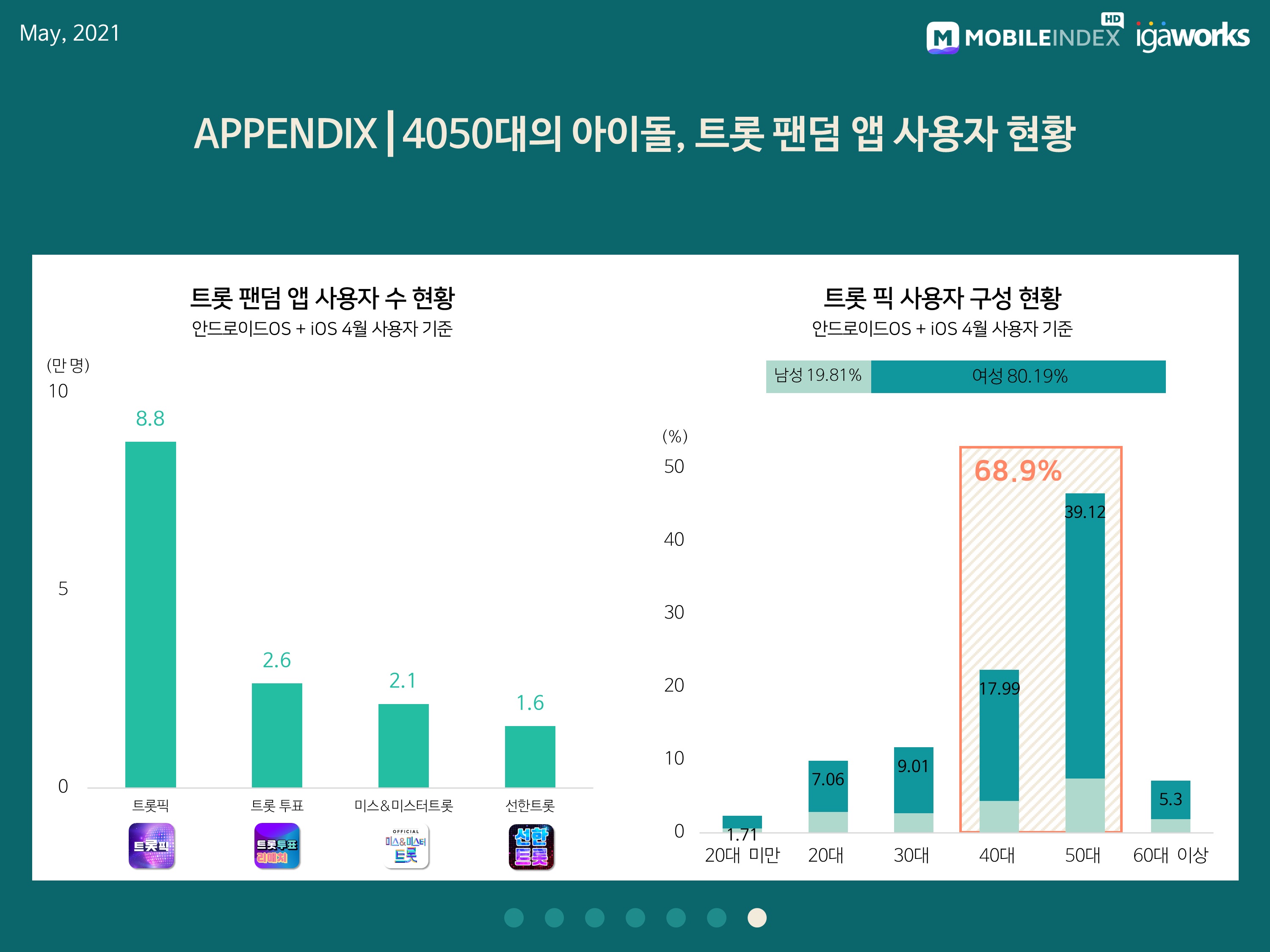 한편, 4월 트롯 팬덤 앱 1위 ‘트롯픽’은 4050대 사용자 비율이 68.9%로 두드러지게 높았으며, 전체 사용자 중 여성이 80.19%였습니다. 반면, 남성은 19.82%를 차지하고 있는 것으로 확인됐습니다.