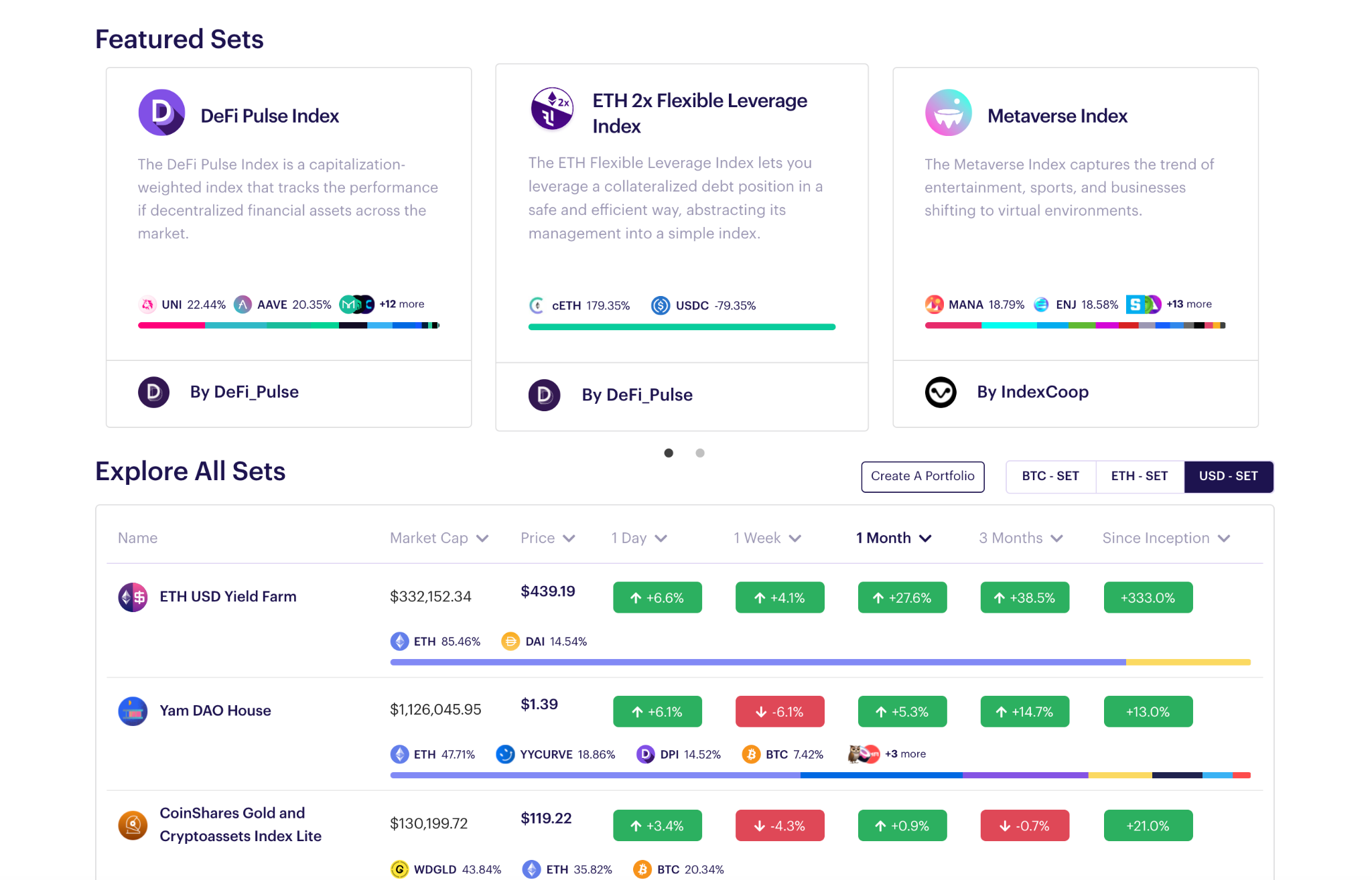 특히 세트 랩스는 2020년말 전통금융 상품 개념인 ETF와 인덱스(Index)펀드를 도입하여 탈중앙화 금융 서비스들의 토큰 가격을 추종하는 디파이 펄스 인덱스(DeFi Pulse Index)와 게임, 대체불가능토큰(NFT) 등 가상세계 서비스들의 토큰 가격을 추종하는 메타버스 인덱스(Metaverse Index) 등을 출시했다. 이를 통해 세트 랩스의 총예치금액(Total Value Locked: TVL)은 작년 180억 원에서 현재 5,000억 원으로 대폭 성장하였다.
