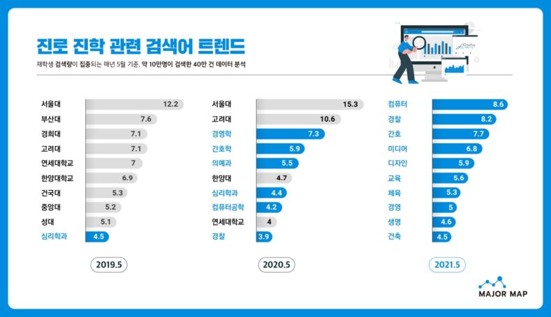 조사 결과에 따르면 2019년 이용자의 상위 10개 검색 항목 중 9개가 유명 대학명이었던 반면, 2020년부터는 상위 검색어에서 대학명이 사라지기 시작했다. 2020년에는 상위 검색어 1위부터 6위까지는 학과명이, 7위부터 10위까지는 대학명이 나타났지만, 2021년에는 2년 연속 1위였던 서울대를 비롯한 유명 대학들이 순위권에서 아예 사라지며 분명한 변화를 보인다.