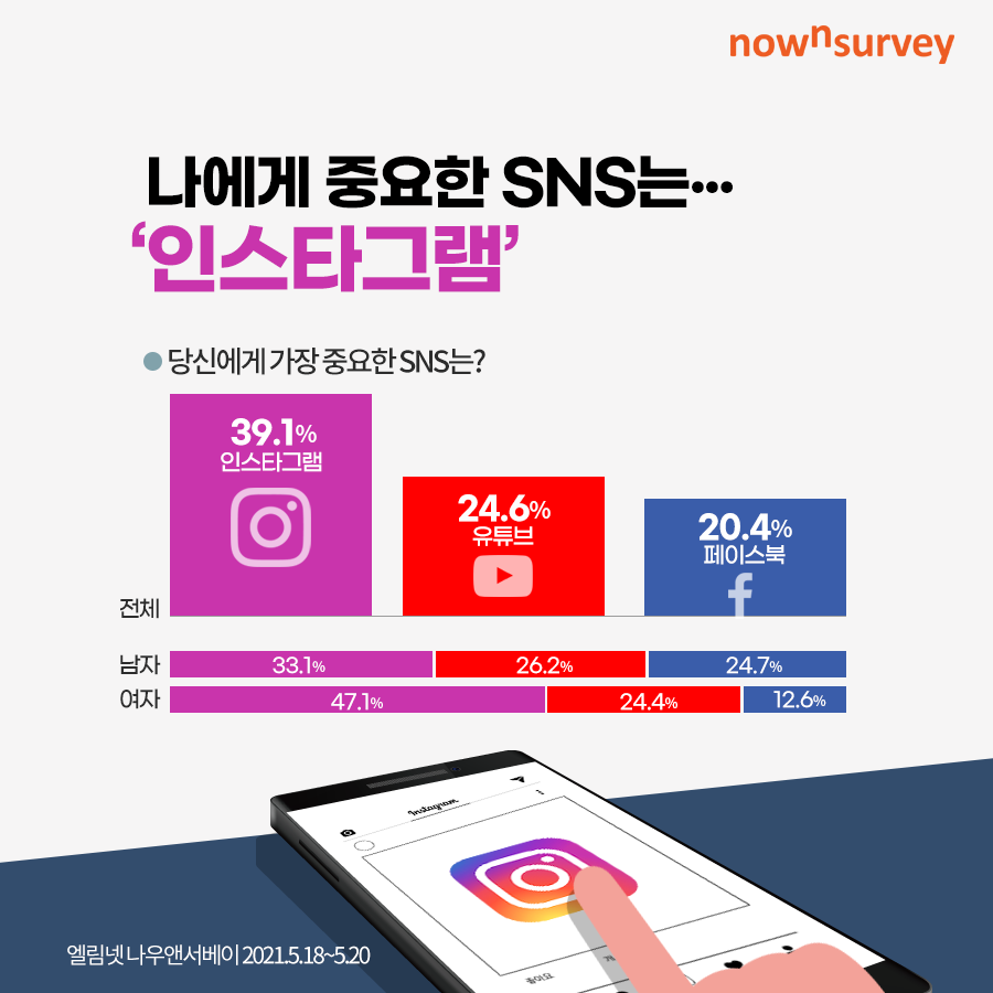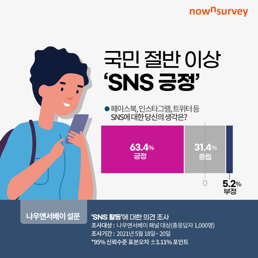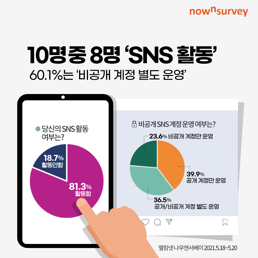 엘림넷 나우앤서베이는 국민의 SNS 활동 현황을 파악하기 위해 나우앤서베이 전국 패널 회원을 대상으로 설문조사를 실시하였다. 설문 기간은 2021년 5월 18일부터 5월 20일까지며 설문 응답자는 총 1000명(남성 573명, 여성 427명)이다.