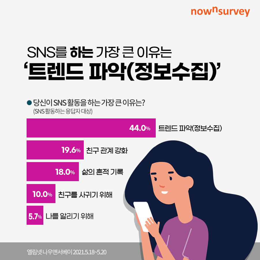 SNS 활동을 하는 응답자 813명에게 ‘당신이 SNS 활동을 하는 가장 큰 이유’를 묻는 질문에는 ‘세상의 트렌드를 파악하기 위해 (정보 수집) (44.0%)’가 가장 많은 응답을 차지하였고, ‘친구와의 관계 강화를 위해 (친밀도 강화) (19.6%)’, ‘나의 삶의 흔적을 남기기 위해 (기록, 알림) (18.0%)’, ‘만나기 어려운 친구를 사귀기 위해 (사회적 관계 확대) (10.0%)’, ‘나의 생각을 세상에 알리기 위해 (자기 표현) (5.7%)’, ‘사업적 목적 (마케팅) (1.5%)’의 순으로 나타났다.