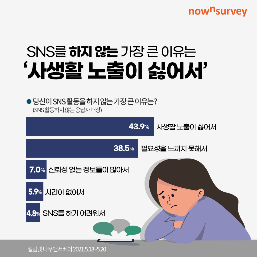 SNS 활동을 하지 않는 응답자 813명에게 ‘당신이 SNS 활동을 하지 않는 가장 큰 이유’를 묻는 질문에는 ‘사생활 노출이 싫어서 (43.9%)’가 가장 많은 응답을 차지하였고, ‘필요성을 느끼지 못해서 (38.5%)’, ‘신뢰성 없는 정보들이 많아서 (7.0%)’, ‘시간이 없어서 (5.9%)’, ‘SNS를 하기 어려워서 (4.8%)’의 순으로 나타났다.