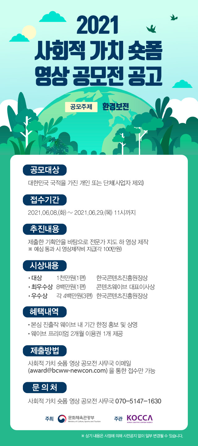 문화체육관광부(장관 황희)와 한국콘텐츠진흥원(원장직무대행 정경미, 이하 콘진원)은 우수한 숏폼 영상 콘텐츠를 발굴하기 위한 ‘사회적 가치 숏폼 영상 공모전’을 개최하며, 전 세계적으로 대두되고 있는 환경보전을 주제로 영상 기획안을 오는 29일까지 접수한다.