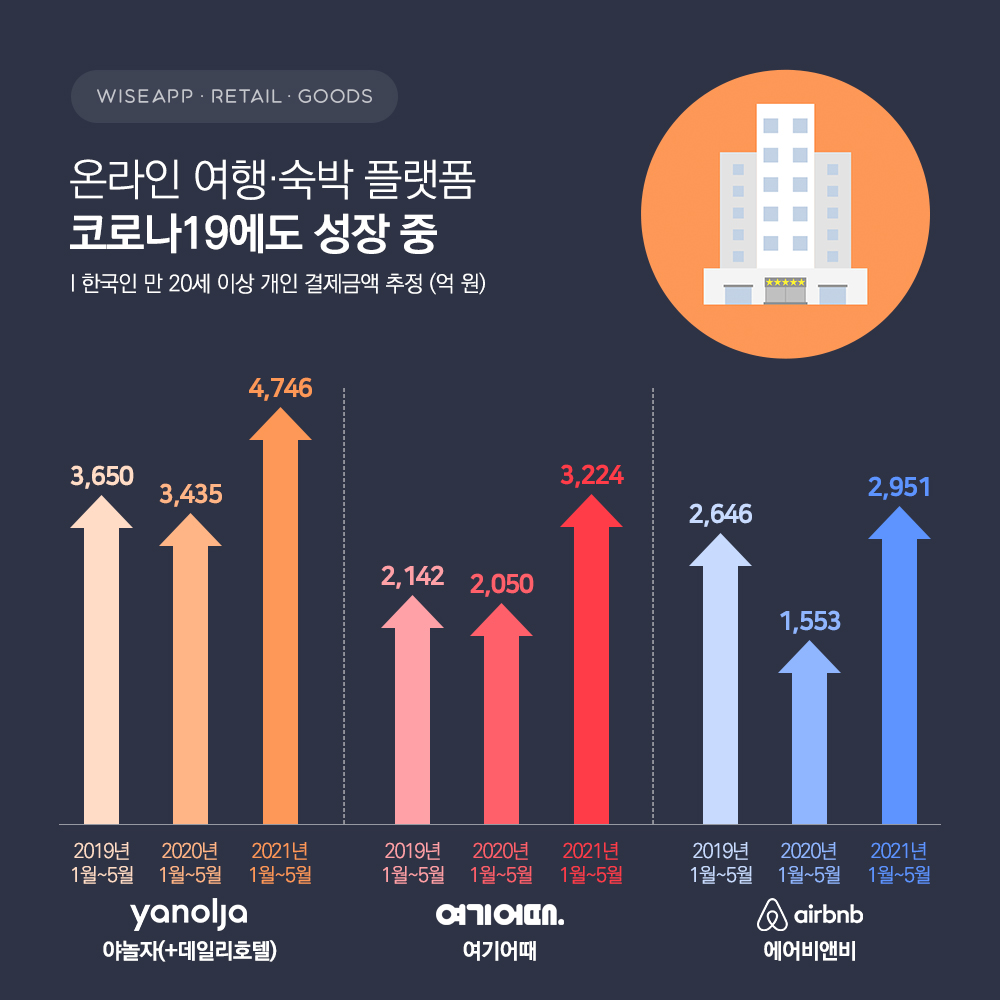 와이즈앱·와이즈리테일이 올해 1월부터 5월까지 만 20세 이상 한국인이 신용카드, 체크카드, 계좌이체 등으로 결제한 금액을 표본조사한 결과, 야놀자(+데일리호텔), 여기어때, 에어비앤비의 결제금액이 코로나19 이전보다 더 늘어난 것으로 조사됐다.