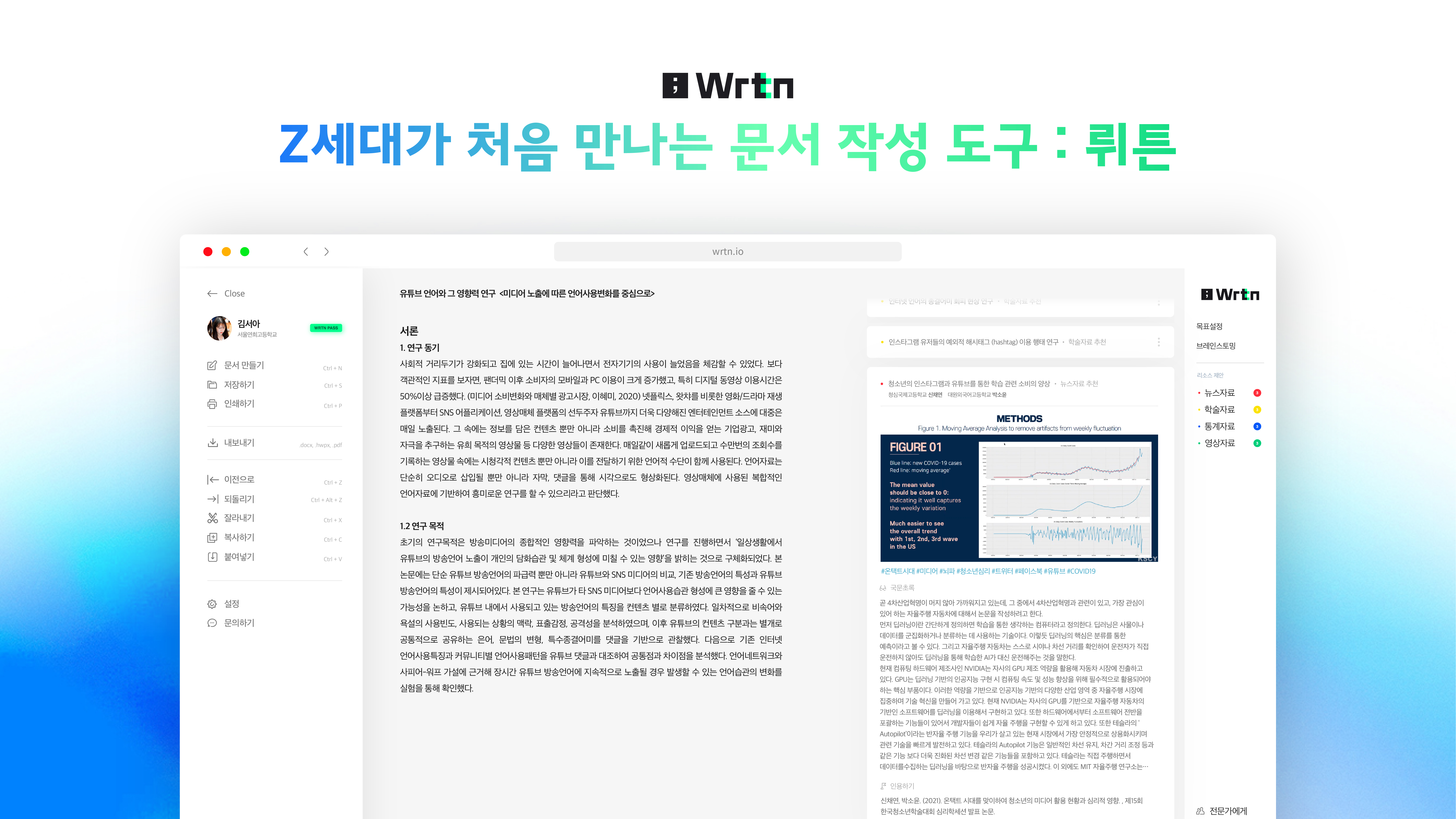 뤼튼은 연구활동, 자기소개서, 에세이 등 교육용 글쓰기에 특화된 온라인 문서 작성 도구다. 글쓰기 과제에 어려움을 겪는 Z세대를 위해 개발되었으며, 별도의 설치 없이 온라인 환경에서 문서 생성이 가능하다. 글의 작성 목적과 유형 및 분야에 따라 맞춤형 템플릿과 프레임워크를 제공하며 글쓰기에서 가장 어려운 단계를 쉽게 해결할 수 있도록 도와준다. 또한 텍스트 마이닝(Text Mining)을 활용해 사용자가 작성 중인 글의 키워드와 맥락을 분석하여 글쓰기에 최적화된 자료와 검증된 콘텐츠를 추천해준다. 향후 작성한 글을 바탕으로 매칭 되는 전문가에게 첨삭과 피드백을 받을 수 있는 기능도 제공할 예정이다.