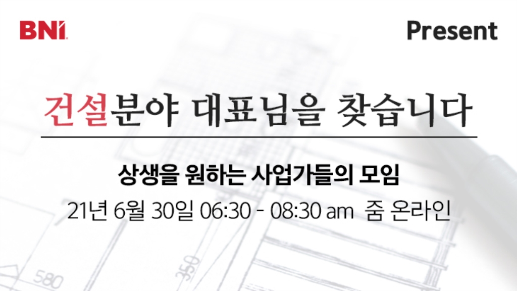 BNI 프레즌트 챕터가 주최하는 ‘상생을 원하는 사업가들의 모임’이 오는 6월 30일 수요일 오전 6시 30분에 진행된다. 온라인 웨비나로 진행되는 이번 행사는 건설 분야를 대표하는 사업가들을 초대해 네트워킹 모임을 만들고자 마련되었다. 행사 당일에는 ▲BNI 프레즌트 챕터 멤버 및 참가자 전원 사업 소개 ▲로담특허법률사무소 임정훈 변리사 <피처 프레젠테이션> 발표 ▲디자인메이트프렌드 한정우 대표 <협업 사례> 발표 등이 진행될 예정이다. 건축 시공사, 소방설계 시공, 특수 인테리어 시공, 전기 설비, 조명기구 판매, 법무사, 부동산 중개, 청소 대행 등 건설과 직간접적으로 관련 있는 모든 분야에서 일하는 사업가와 협업이 필요한 기업의 대표라면 누구든지 참석할 수 있다.