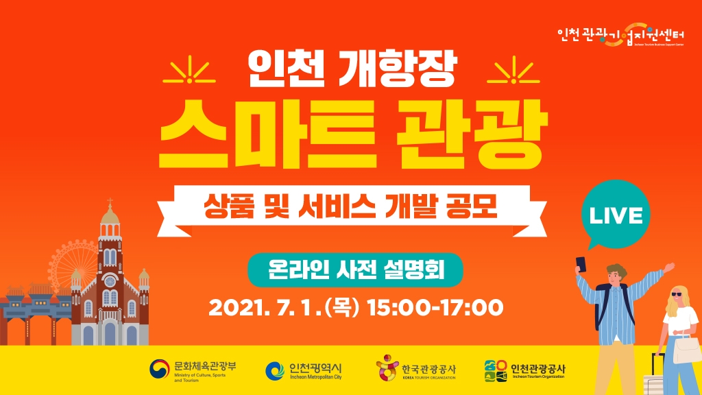 문화체육관광부, 인천광역시, 한국관광공사, 인천관광공사가 주최하는 ‘인천 개항장 스마트 관광상품 및 서비스 개발 공모 온라인 설명회’가 오는 7월 1일 목요일 15시에 진행된다. 온라인 웨비나로 진행되는 이번 행사는 인천 개항장 스마트 관광상품 및 서비스 개발 공모 행사를 알리고, 상품 및 서비스의 공모를 받고자 개최되었다. 웨비나는 ▲스마트관광도시 및 인천e지 앱 소개 ▲공모 안내 ▲질의응답 ▲설문조사 및 경품 추첨 순으로 진행된다.