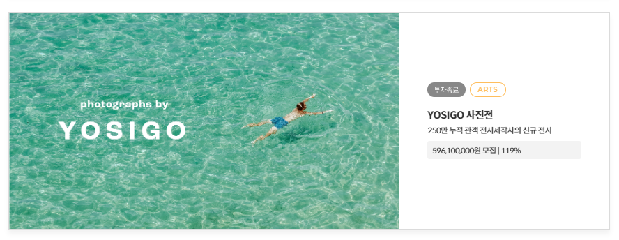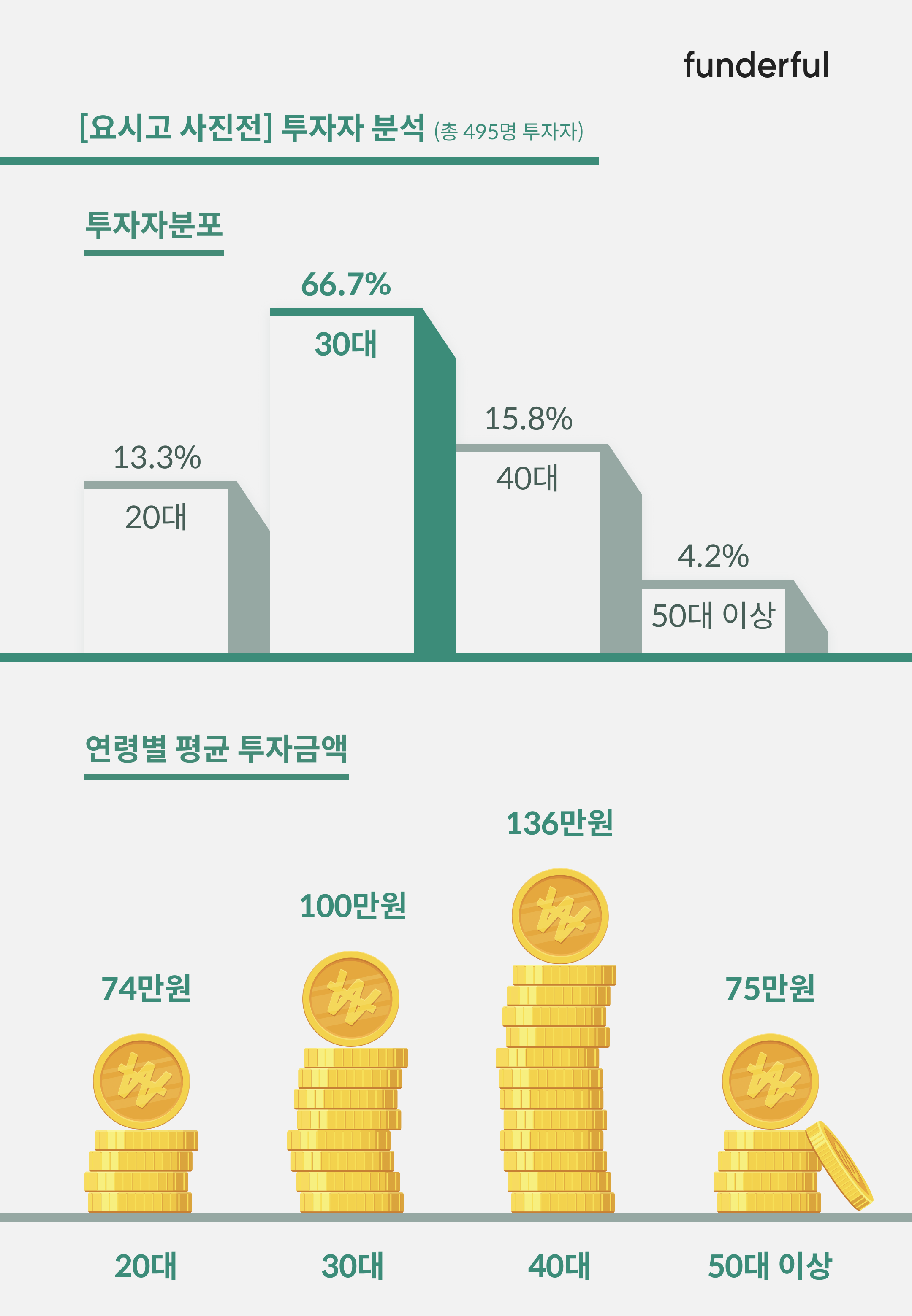 K-콘텐츠 투자 플랫폼 ‘펀더풀’(대표자: 윤성욱, www.funderful.kr)에서 진행한 전시 투자 프로젝트 <요시고 사진전>에 5억원의 투자금이 몰리며 아트테크의 인기를 확인할 수 있었다. ‘펀더풀’ 측은 투자자 비율 중 80%가량이 MZ세대인 2040이라 밝혀 이들의 새로운 투자 트렌드로 아트테크가 인기를 끌고 있음을 확인했다.
