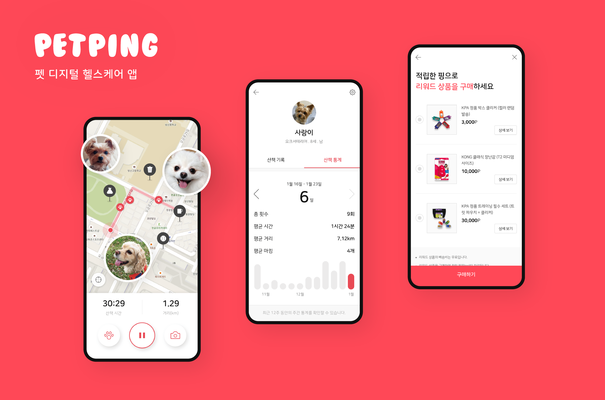 정기적인 건강미션을 달성하게 되면 리워드 핑(Ping)을 제공한다. 적립한 리워드 핑(Ping)으로 반려견 케어에 도움을 주는 리워드 상품을 핑샵에서 구매할 수 있다. 산책뿐만 아니라 향후 다양한 건강 미션으로 업데이트될 예정이다.