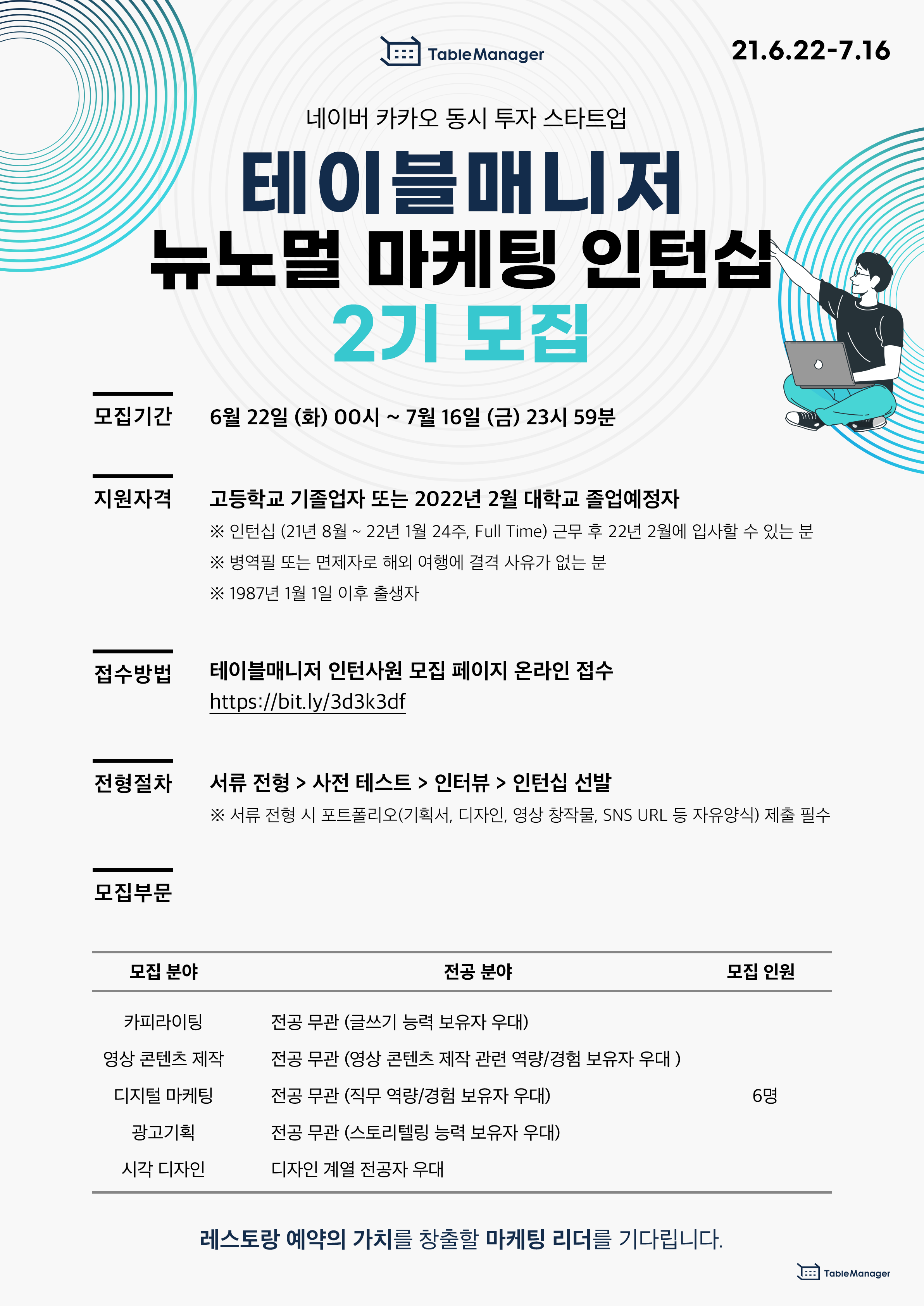 테이블매니저는 오는16일까지 2기 채용 연계형 인턴사원 모집 페이지(https://bit.ly/3d3k3df)에서 서류 접수를 진행한다. 고등학교를 졸업한 인재, 대학교 재학 중일 경우 2022년 2월 졸업 예정자라면 누구나 지원할 수 있다.