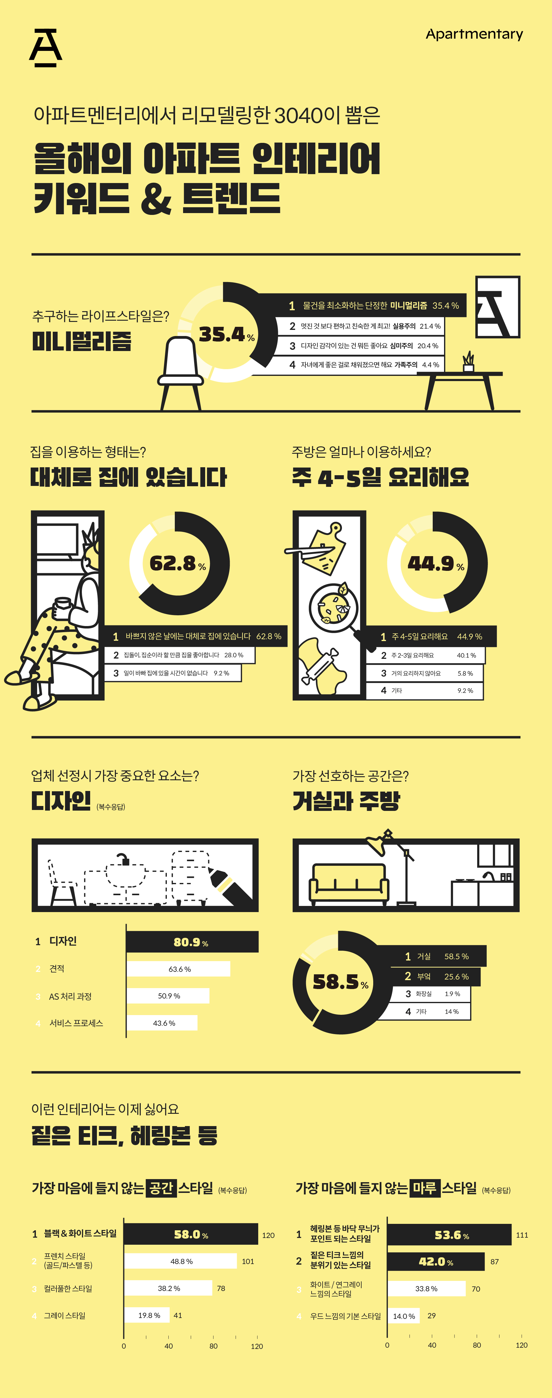 아파트멘터리 김준영 공동대표는 “코로나 이후 3040 미들노트 세대는 ‘미니멀리즘 집콕 라이프’를 향유함을 조사를 통해 확인할 수 있었다. 3년 전 자체조사에서 업체 선정 기준으로 ‘견적’이 압도적으로 중요했다면, 이제는 ‘디자인, AS, 프로세스’ 등 가치소비를 중시하는 모습이 눈에 띈다”고 말했다.