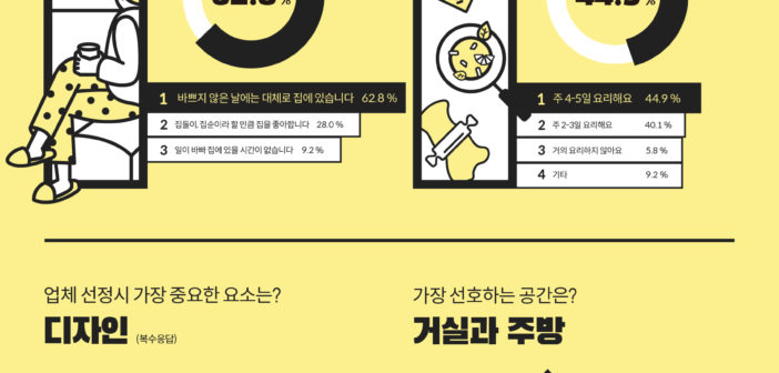 프리미엄 아파트 인테리어 전문 브랜드 아파트멘터리에서 리모델링한 3040 고객 대상 아파트 인테리어 인기 키워드를 바탕으로 트렌드를 조사했다. 최근 1년간 서울 및 경기권 평균 30평대 아파트를 보유한 시공 고객 대상 설문을 분석한 결과다. 이들은 우리 가족의 라이프스타일로 ‘미니멀리즘’을 가장 많이 선택했다. (전체 응답자 중 35.4%에 해당) 집을 이용하는 형태에 대해서도 과거와는 다른 모습이었다. 바쁘지 않은 날에는 대체로 집에 있는 편이라고 답했다. (전체 응답자 중 62.8%에 해당) 가장 중요하게 생각하는 공간은 거실과 주방 순이었다. 팬데믹으로 재택근무나 홈스쿨링 등 집에 있는 시간이 많아지면서 요리를 하는 빈도도 높아졌는데, 주 4~5일 요리한다는 가구가 압도적으로 많았다. (전체 응답자 중 44.9%에 해당) 인테리어 트렌드도 달라지는 경향을 보였다. 업체 선정 시 가장 중요한 요소로 ‘디자인’을 꼽았다. 한 때 유행했던 ‘짙은 티크’, ‘헤링본 스타일’은 이들에게 비 선호 자재였다. ‘미니멀리즘’을 추구하는 라이프스타일에 맞춰 모던하면서도 자연스러운 공간을 추구하는 추세다. 아파트멘터리 김준영 공동대표는 “코로나 이후 3040 미들노트 세대는 ‘미니멀리즘 집콕 라이프’를 향유함을 조사를 통해 확인할 수 있었다. 3년 전 자체조사에서 업체 선정 기준으로 ‘견적’이 압도적으로 중요했다면, 이제는 ‘디자인, AS, 프로세스’ 등 가치소비를 중시하는 모습이 눈에 띈다”고 말했다.