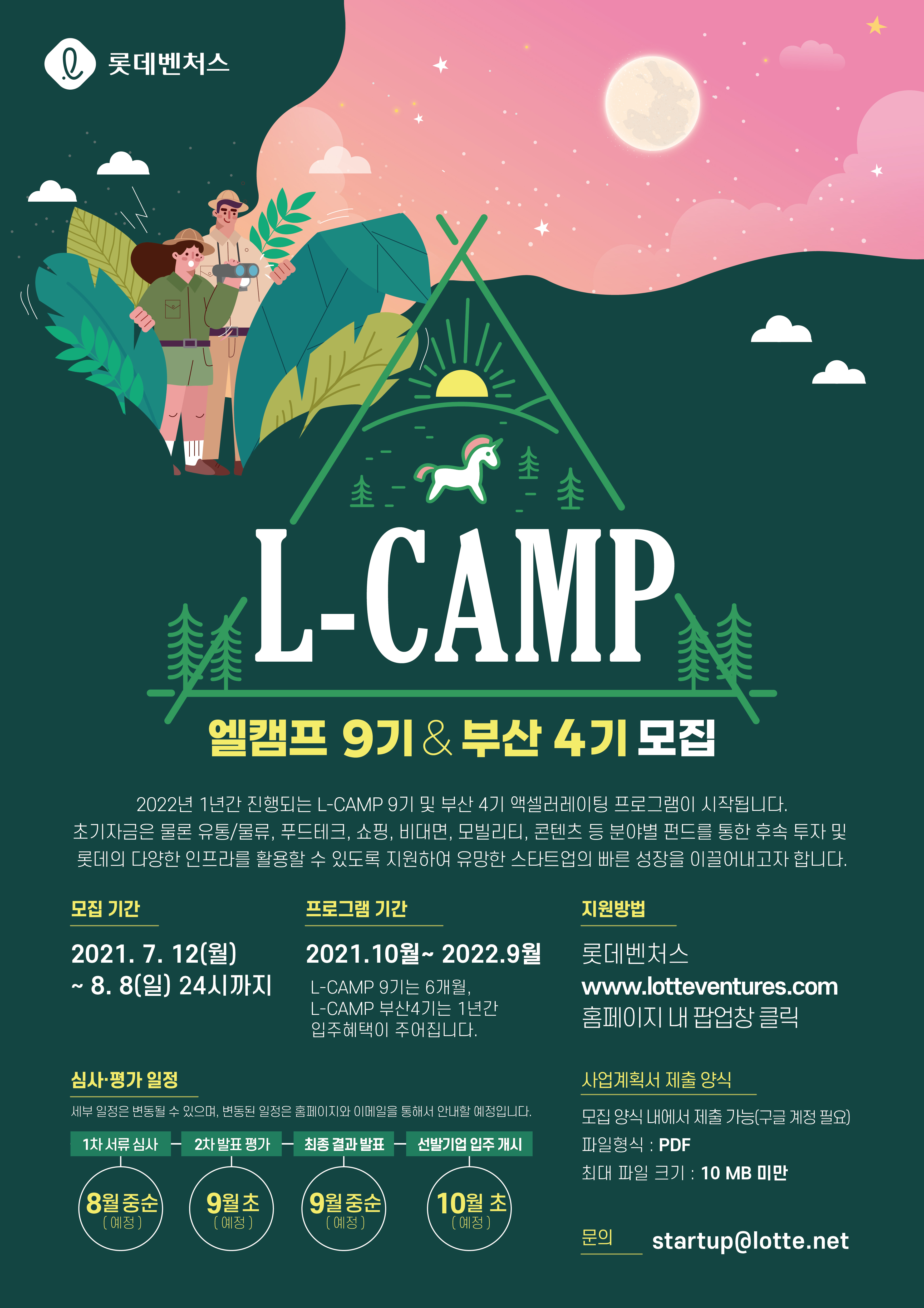 롯데벤처스는 오는 8월 8일까지 L-CAMP(이하 엘캠프) 9기와 부산 4기에 참가할 스타트업을 모집한다.