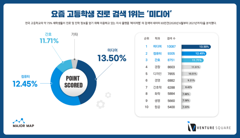 ㈜메이저맵은 전국 고등학교의 약 75% 재학생들이 진로 및 진학 정보를 얻기 위해 이용하고 있는 자사 플랫폼 ‘메이저맵’의 검색어 데이터 65만건(2020년 6월부터 2021년까지)을 분석했다.
