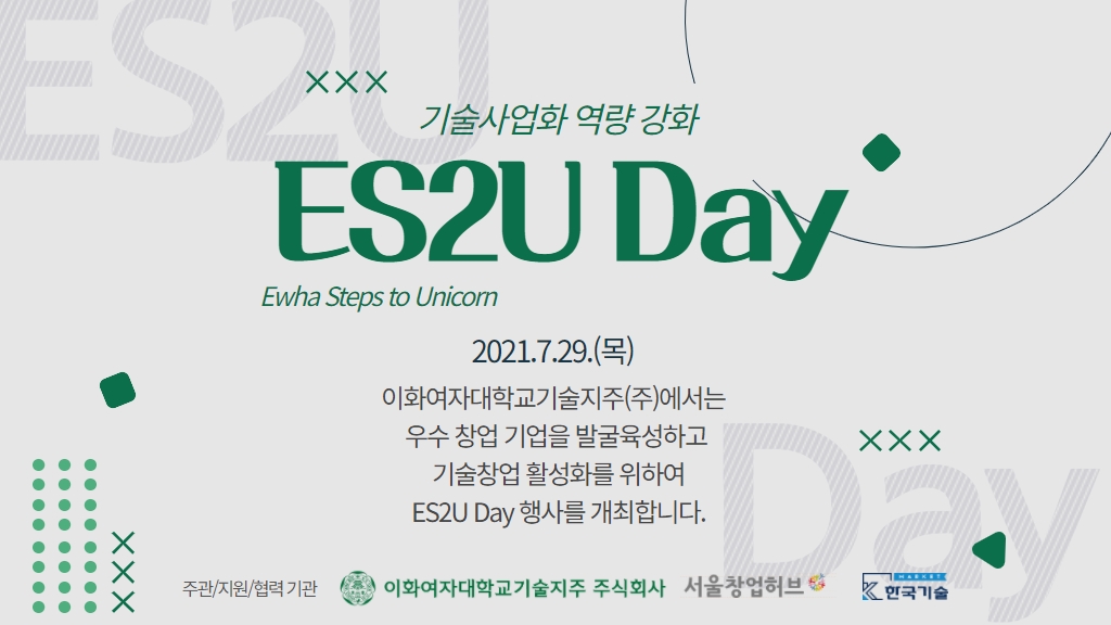이화여자대학교기술지주 주식회사, 서울창업허브, 한국기술마켓이 공동 주최하는 ‘ES2U Day 기술사업화 역량 강화’가 오는 7월 29일 목요일 9시 30분에 진행된다. 이번 행사는 우수 창업 기업을 발굴육성하고, 기술창업 활성화를 위해 마련되었다.