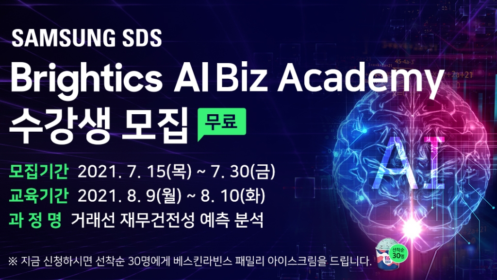 삼성SDS가 주최하는 ‘삼성SDS AI 비즈니스 아카데미 (with Brightics AI)’가 오는 8월 9일 월요일부터 8월 10일 화요일까지 양일 진행된다. 참가자는 이틀간의 교육을 통해 Brightics AI와 함께 데이터 분석하는 법을 배운다. 웨비나에 대한 자세한 내용 확인과 참가 신청은 이곳에서 할 수 있다.