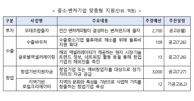 모태펀드 2700억 원을 출자해 6100억 원 규모의 펀드를 조성하기 위해 출자사업 공고를 8월에 진행한다. 중소벤처기업의 해외진출 촉진과 물류부담 완화를 위한 현지 액셀러레이팅 및 수출바우처 지원을 즉시 시행한다.