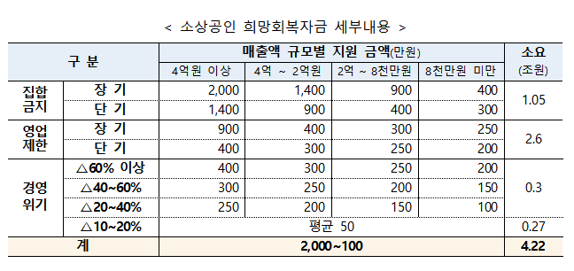 소상공인 희망회복자금은 방역조치 수준ㆍ기간, 사업체 규모 등 업체별 피해 정도를 반영해 지원유형과 지원금액을 세분화했다.