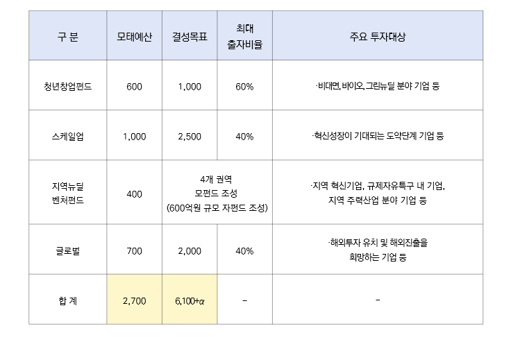 중기부는 모태펀드 4차 정시 출자사업을 통해 총 2,700억원을 출자해 청년창업펀드, 스케일업펀드, 지역뉴딜벤처펀드, 글로벌펀드 등총 약 6,100억원 규모의 벤처펀드를 조성한다.