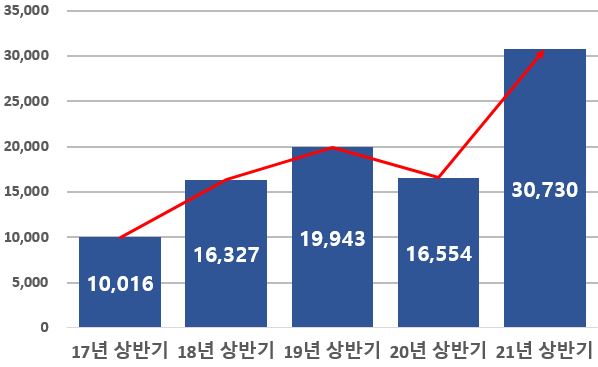 ‘21년 상반기 벤처투자 실적은 작년 상반기 대비 약 85.6% 증가(+1조 4,176억 원)한 3조 730억 원으로 상반기 기준, 역대 최대 실적을 달성했다.