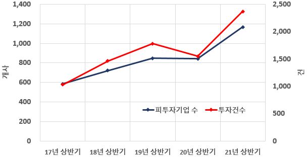 상반기 투자 실적 3조 730억 원은 연간 실적으로 최대치를 기록했던 작년 4조 3,045억 원의 이미 70%에 달하는 규모이다. 올해 상반기 투자 건수와 피투자기업 수 역시 각각 2,367건, 1,166개사로 확인되면서 상반기 기준, 역대 최다 실적을 기록했으며 건 당 투자 금액은 평균 13.0억원, 기업 당 투자 금액은 평균 26.4억 원으로 나타났다.