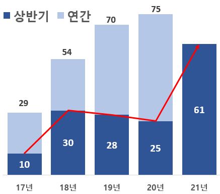 마지막으로 ’21년 상반기 벤처투자를 받은 기업들 중 100억원 이상 투자를 유치한 기업들은 역대 상반기 중 가장 많은 총 61개사로 확인됐다.