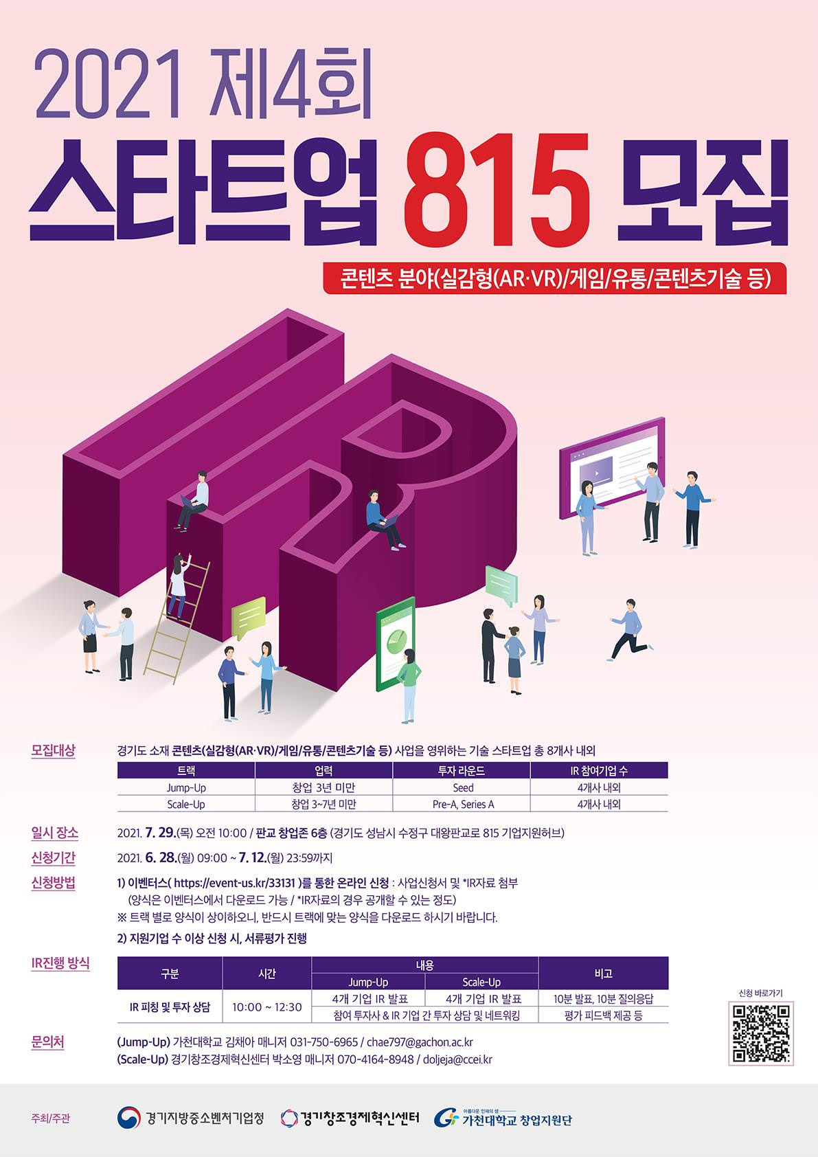 스타트업 815는 경기혁신센터가 경지지방중소벤처기업청‧가천대학교·수원대학교와 협업해 매월 진행하는 혁신기술 분야별 투자설명회다. 이번 제4회 스타트업815는 콘텐츠 분야(실감형(AR·VR), 게임, 유통, 콘텐츠기술 등) 스타트업의 성공적인 투자유치를 지원하고 창업자와 투자자간 활발한 네트워킹을 도모하기 위해 개최됐다.