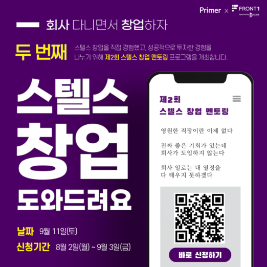 스텔스 창업 멘토링 프로그램은 직장인 예비창업자로서 사업 아이디어가 있고 실행할 의욕과 능력을 가진 사람이면 누구나 지원할 수 있으며, 자세한 내용은 접수 페이지(https://apply.primer.kr/incubations/25/letters/apply) 및 프라이머 홈페이지(https://www.primer.kr)에서 확인할 수 있다.