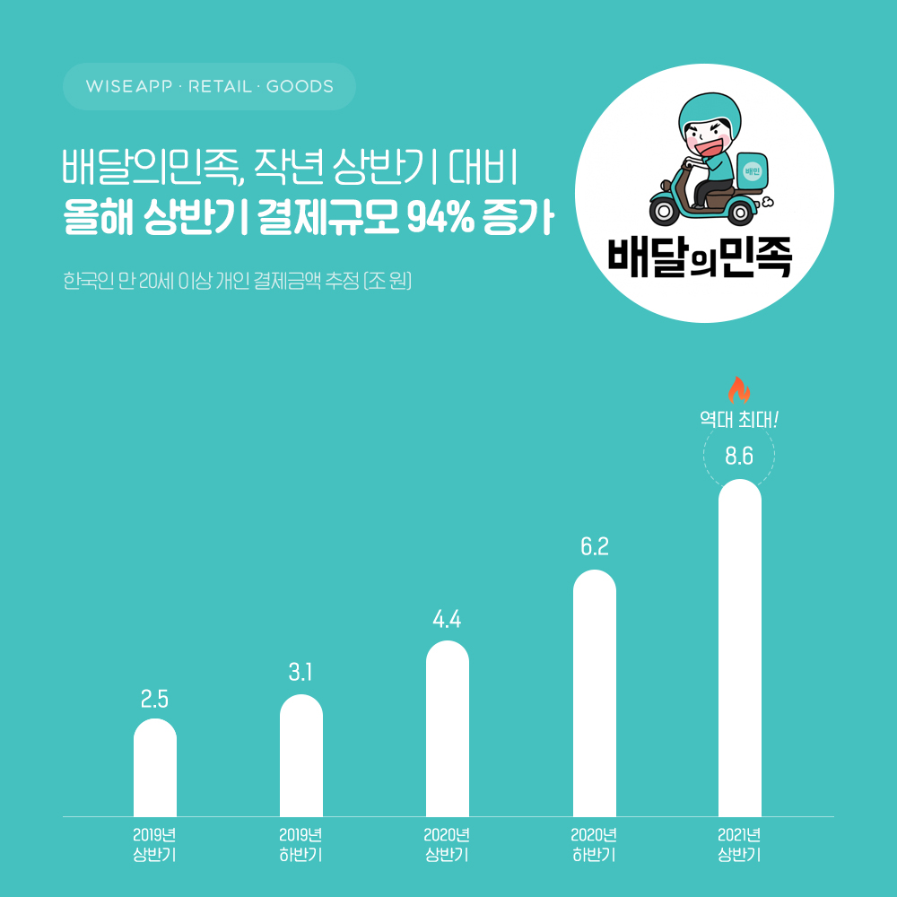 와이즈앱·리테일·굿즈가 한국인이 신용카드, 체크카드, 계좌이체, 소액결제 등으로 결제한 금액을 표본조사한 결과 올해 상반기의 배달의민족의 결제추정금액은 8조 5,591억 원으로 작년 상반기(4조 4,172억 원) 대비 결제규모가 약 94% 상승한 것으로 조사됐다.